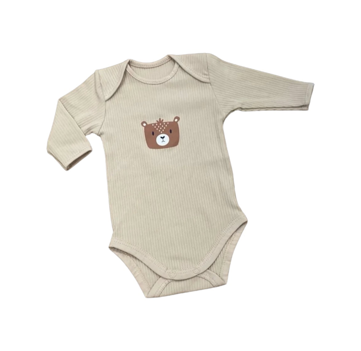 Baby Ribbed Long Sleeve Bodysuit – Beige with Bear Print 🐻